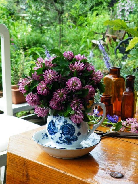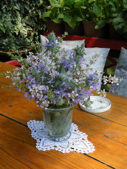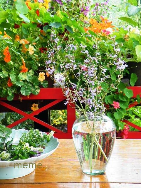 6月の庭でハーブを摘んで水揚げ中