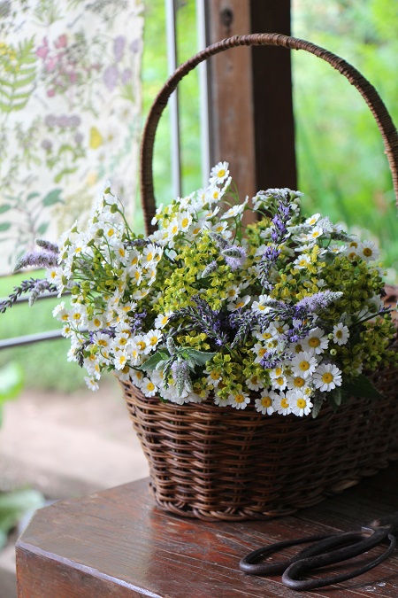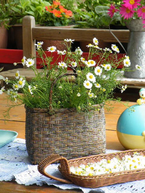 カモミールを手提げかごにアレンジ