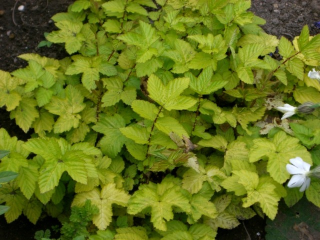 園芸品種の‘Flore Pleno’は八重咲きで梅雨空にお似合いです。葉に斑が入った‘Variegata’ やゴールデン‘Aurea’もありますね。気持ち日陰になるところに植えています。