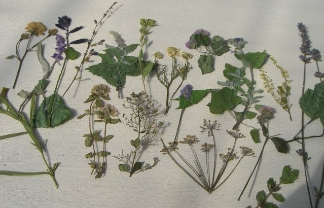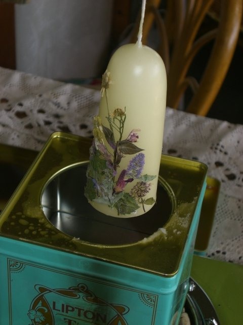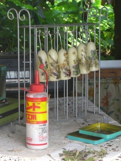 ハーブの押し花を貼ったキャンドルです。押し花を作り溜めてある容器には約2㎏のシリカゲルを入れてあるのですよ。1年の役目が終わってピンク色になったらフライパンで炒ってブルーに再生させます。これには案外時間が掛るので折角の休日の時間を取られているような思いがしますが、これが無くては始まりませんものね。
