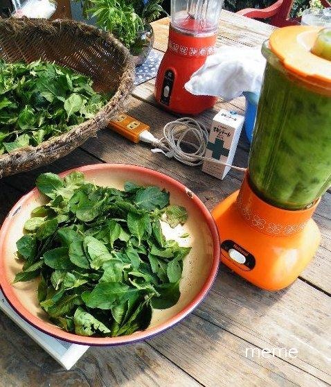 2. 生葉100gに対し水2リットル位を用意して数回に分けてミキサーにかけ、ガーゼの袋でこします(染料液)。