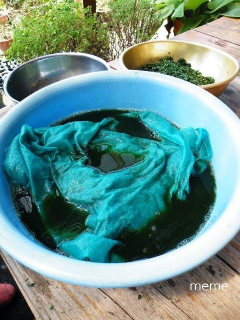 1. シルクがよく染まります。今年は白い大判スカーフ2枚で110gですので、3倍の藍(タデアイ)の生葉330gを摘みます。