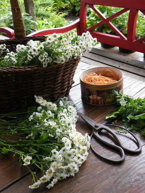 吊り下げ始めた今年のハーブとサルビアです。できることならカラッとした季節にすべての収穫をしたいところですが、‘その時にしか咲かない、摘めない’ものがありそうもいきません。庭の小屋の天井に吊るすといった自然乾燥でドライフラワーを作っている私は、お天気やスケジュールと相談しながら地道に収穫していくことになります。