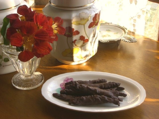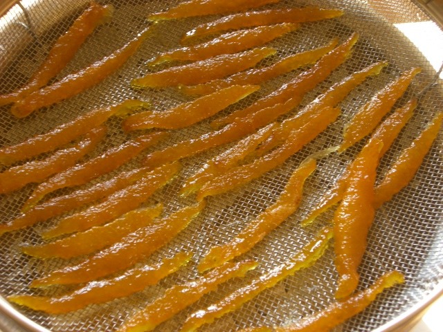 さて、調子のよい本柚子を使って柚子のピールチョコレートを作りました。お湯にほんの少し塩を加えて皮を茹で、白い部分を取り除きます。細く切ってお湯に砂糖を溶かして煮て乾かします。板チョコを電熱器で溶かしてコーティング。洋酒を効かせても洋酒と頂いても^^