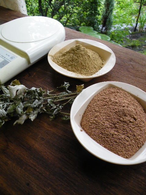 庭のハーブを摘んで蚊取り線香作りです。蚊取りの薬効としての除虫菊の花は、うちでは4月から9月までぼつぼつと咲くので見つけると摘んで干しザルに並べておきます。少しでも多く収穫ができるように‘10鉢育てています’というとたっぷり収穫できそうですがこれがなかなか。シジミのドライのような・・で分かってくださいね^^; 蚊取りインセンスや蚊取り線香の小巻をちょこっと作るくらいならよいのですが、実用にするには如何にしても足りません。そんな時は市販の除虫菊の乾燥(パウダー)が便利です。