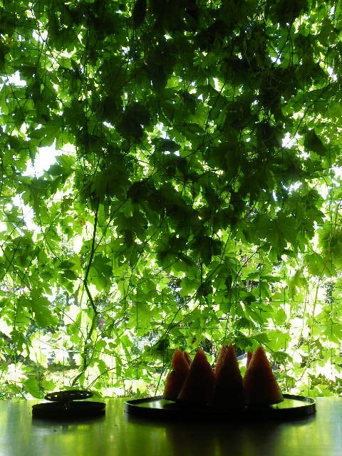 緑のカーテンとかグリーンカーテンとか春先からよく耳にします。うちもゴーヤの苗を3つ買いました。薄いカーテンが要らなくなりました。網戸も邪魔なくらい美しい緑です。時折の風が苦い香りを運んできます。
