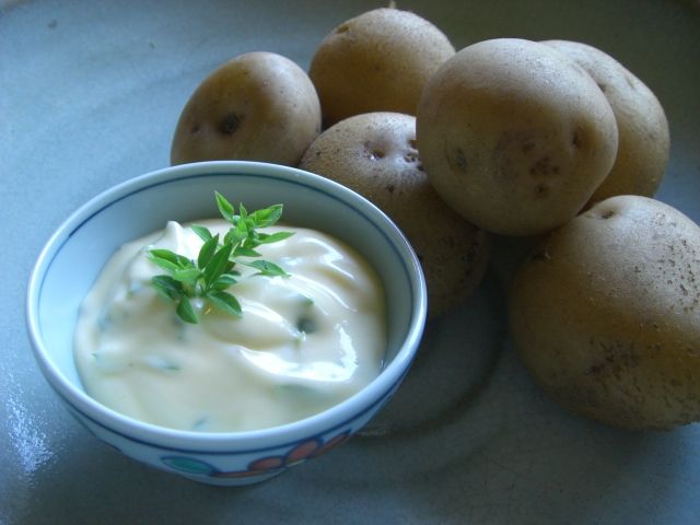 フレッシュな卵で作ったマヨネーズと摘みたてのグリークブッシュバジル。そして蒸した新じゃがの皮の風味。おいしいね!