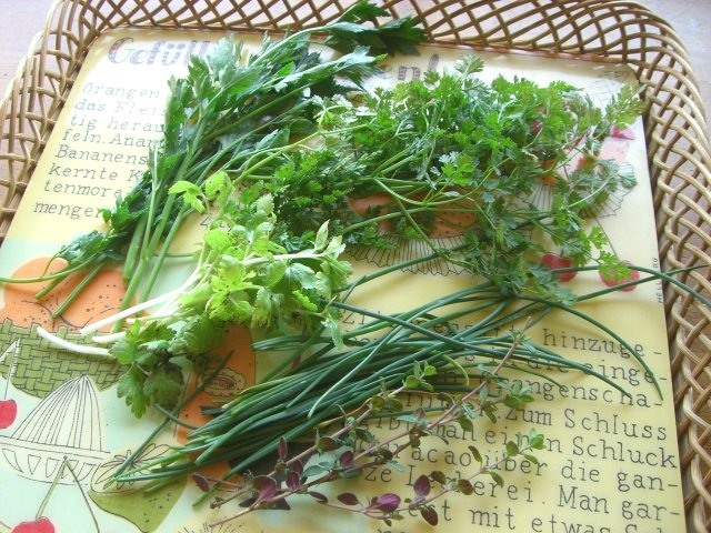 ここのところこのフレーム内のお野菜ハーブが食べ頃で、適当にチャービル、イタリアンパセリ、スープセロリ、チャイブ、レモンタイムを摘みました。