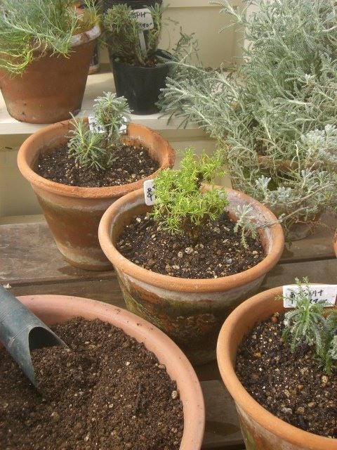 先週末は黙々とサントリナの植え替えをしました。できれば秋に剪定をサボった鉢植えは軽く剪定をして一回り大きな鉢にしたいのですが、鉢を置く棚が定員オーバーなのです。いつも元の同じ鉢へ植え替えるため、根も枝も3分の1に切り詰めて新しい用土にしています。ビニールポットに挿し木をしておいたものは頃合の鉢へ定植。どちらも急に眠りから覚めたように元気になるでしょう。