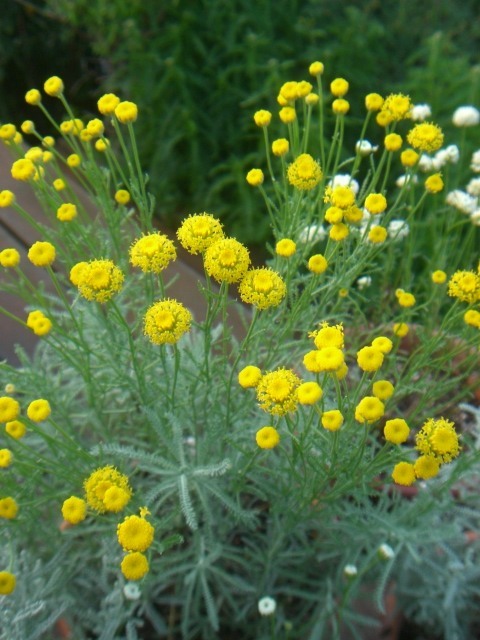 サントリナは防虫ハーブやガーデンの縁取りとして有名ですね。小さな小さな打上げ花火のような花や珊瑚のような感触の葉がきれいです。花や葉の色や感じが違ういくつかの種類を育てていますが、うちでは花の時期がほとんど同じで6月です。