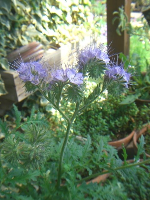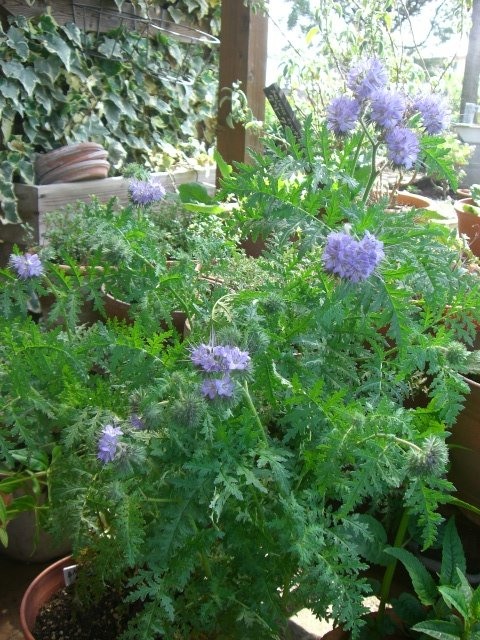ファセリア タナケティフォリアはふっさりと1mにもなる1年草のハーブです。雄しべが目立つ藤色の花が次々に咲き出してきました。香りがほんわか。筒状花が外側に曲がった集散花序を近くで見るとユニークです。手元のハーブの本 によると葉は良質の緑肥になるそうで秋に土壌に鋤き込むのだそうです。
