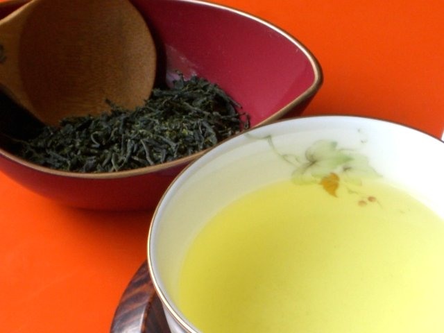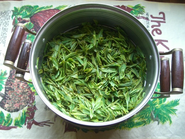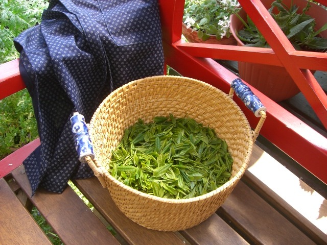 チャの木は1本なので大袈裟なのですが、春の大型連休は茶摘みをします。濃い緑の葉の上に柔らかそうな黄緑の芽と若葉。一心三葉で摘み取り蒸し器へ入れます。日本茶はここで加熱する事により酸化酵素を破壊~乾燥の過程で濃い緑色とビタミンCを残す事が出来るそうです。何回かやさしく菜ばしで混ぜて蒸したところです。