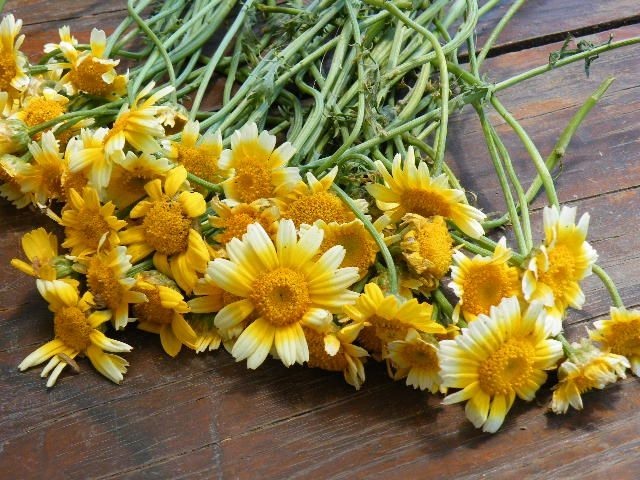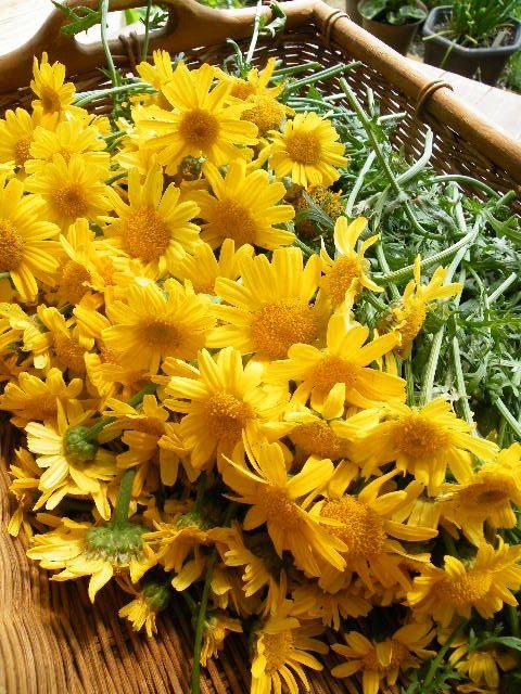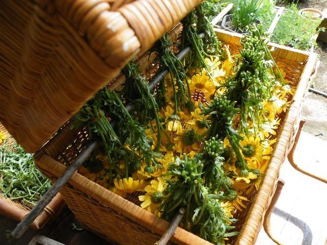 ‘野菜だけにしておくのはもったいない’春菊の花の摘み取りです。小さな花は料理のあしらいに、フレッシュでタッジーマッジーやアレンジに。ドライフラワーでリース作りも面白いです。春菊の花と一口に言っても一色に見えるものや二色に見えるものなどがありますね。