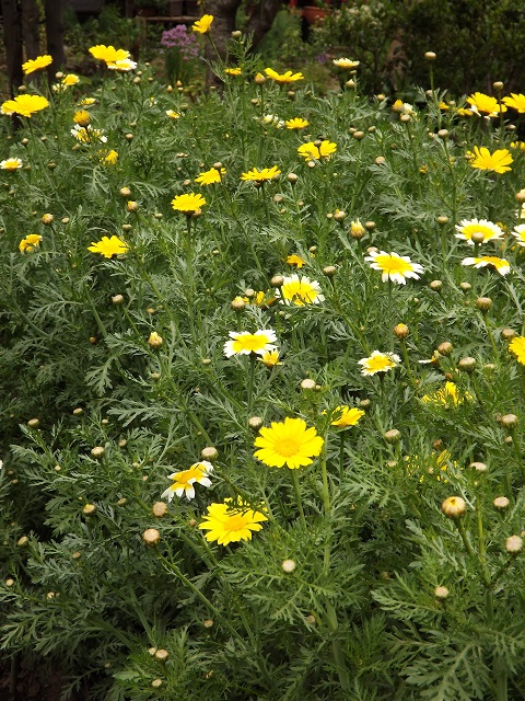シュンギク(春菊)の種を買いに行くとその品種の多さに迷ってしまいます。パッケージには野菜の写真ばかりですので花はどれが咲くのかはおたのしみになりますね。ほんのわずかしか蒔かない我が家は ひと袋=数年同じ花 なんて事もあったのですよ。