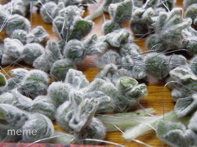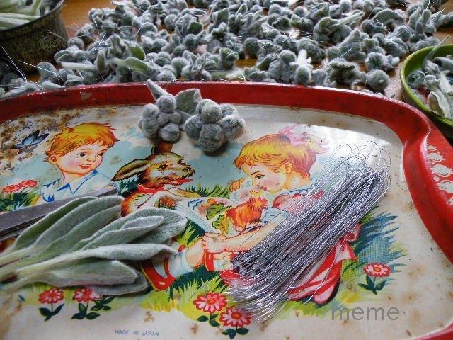 今年はStachys byzantine ラムズイヤー(スタキス ビザンティナ) で‘ハーブのクリスマスツリー’を作りました。秋に生乾きの葉で‘ラムズイヤーの照る照る坊主’を作っておいたのですよ。これは1枚の葉の裏に、丸めた葉を乗せて、針金で丸く閉じて作ります。以前、ラムズイヤーの生乾きの葉がまるでフエルトのようでしたので、ふと考え付いたパーツです。