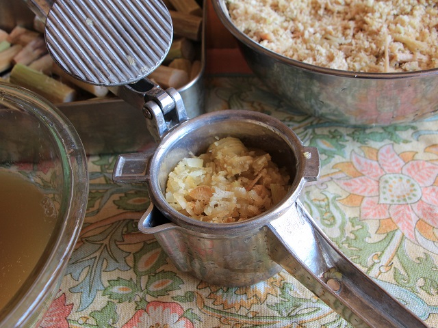 - 冷凍したサトウキビを自然解凍して荒く刻む