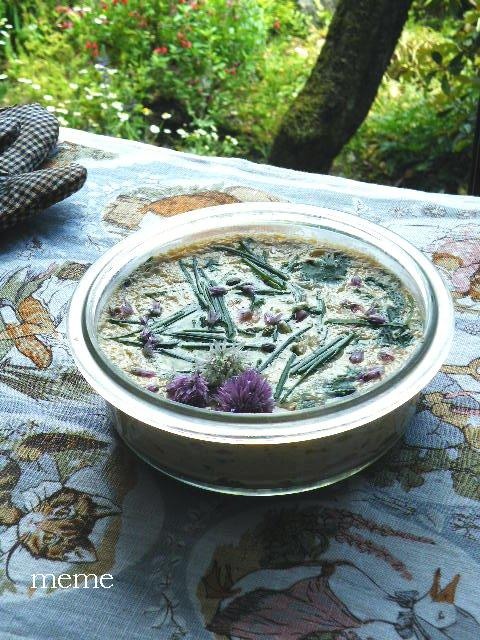 5月の庭でチャイブAllium schoenoprasum の花を使い、衣を薄く付けて線香花火の様に揚げたフリッターや、苧環蒸などの和風卵料理をよく作ります。