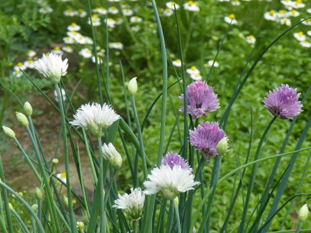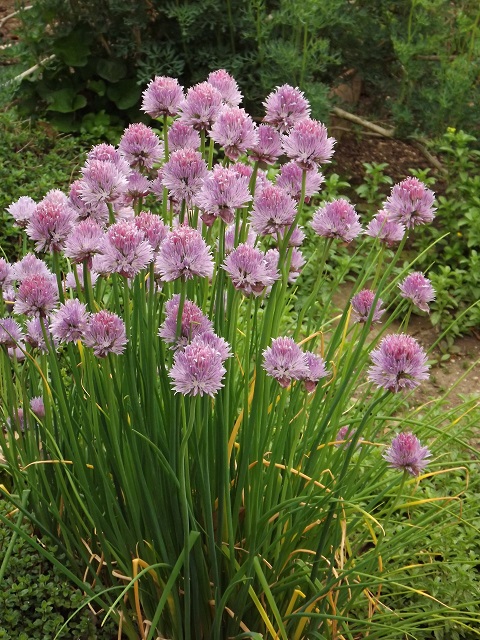 チャイブChivesの葉をプチッと摘まんで嗅ぐとお馴染みのネギの匂いがして、しかもエディブルフラワーや野菜として利用OKとなれば、言わず語らずの内に‘料理のひとつ、ふたつ’になりますね。納豆や天ぷら、フリッター、和風だしをきかせた卵料理、そして柔らかい風味なのでサラダに加えてと、こだわることなく使っています。エゾネギとかセイヨウアサツキと言われるとすぐ納得できるのですが、フランス料理店を営む知人がシブレットCibouletteというと、あっチャイブね、と今以て変換が必要な私です。