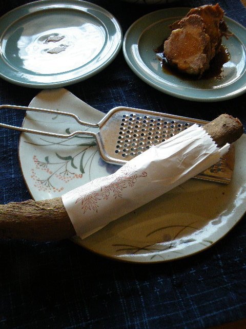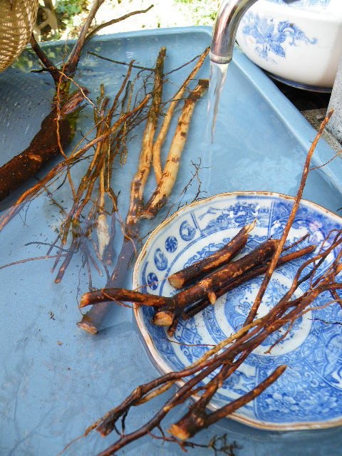 細い根も洗い乾燥させて小束にしておき、お菓子やクラフトに使っているのですよ。頃合いの太さの根は台所に吊るしてありますが、見かけが擂り粉木の様で、又このままでは特に匂いませんので食品には見えないですね。ですがすりおろして粉にするとたちまちあの匂いが蘇ります。この自家製スパイスは、例えば焼き豚やたれを作る時に使っています。