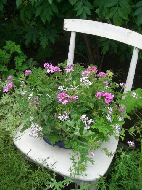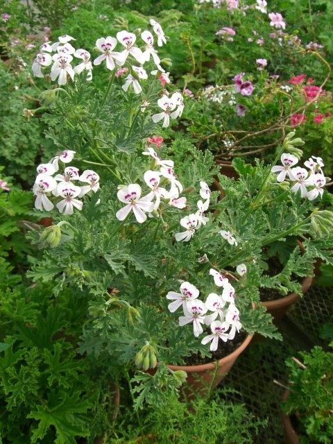 灰色がかった緑の深い切れ込みの葉、印象に残るブロッチが美しいブランドフォルディアナムゼラニウムPelargonium‘Blandfordianum’が満開です。うちでは庭植えは難しいので鉢植えにして直接雨がかからない場所に置き、夏は半日陰、冬は無加温のフレームに入れて育てています。数あるセンテッドゼラニウムの中で性質は弱い方ではないかと思うのですよ。忘れずに挿し木をしておくようにしています。