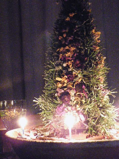 ご馳走を少しして食卓の真ん中にツリーを置き、周りに小さなキャンドルを灯しましたら、温められたローズマリーが香りをほんのり漂わせています。‘部屋の香りもご馳走’ですね。