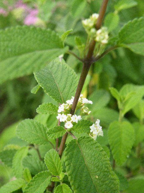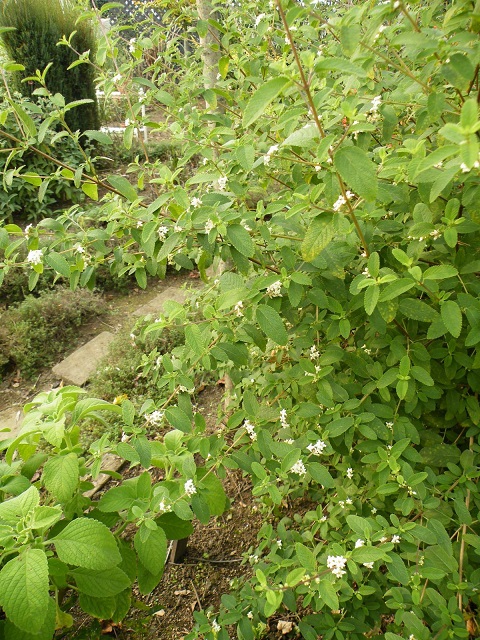 メキシカンオレガノ Lippia graveolens はとても寒さに弱い木本のハーブです。うちは軽く剪定をして1.2m~1.5mにしますが、2m位になりますね。アイボリーの花色と美しい緑をしたざらっとした葉で、うちに来てから10年以上経ちますが大事にしているハーブのひとつなのですよ。花期は6月から10月頃まで、挿し木でバックアップ、秋に切り詰め堀上げ越冬、十分暖かくなりました5月に庭に植え付け、のサイクルで育てています。