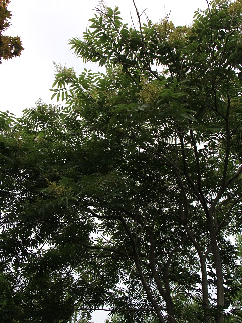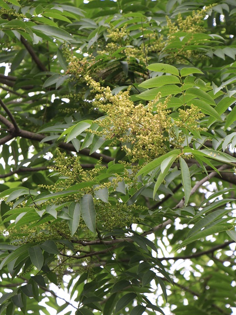 15m位になる落葉高木です。6月~7月に淡黄色の花が穂状に咲き、丸い灰緑色の果実になります。芽が出始めた黒い実がたくさん落ちている時期があり、それを友人たちにあげましたがまだ実がならないと言いますので年数が掛かるのかもしれません。