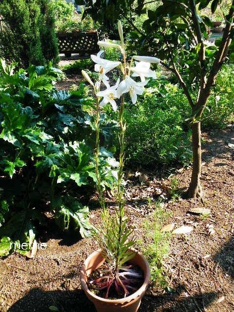 マドンナリリーが一輪、そしてまた一輪と咲き出しました。華奢な茎ですのに先日の様な強い風にも倒れることなく花を咲かせています。小さ目の美しい白い花の匂いはくどくなく、清々しいですね。この香りは香水の原料にされるそうです。