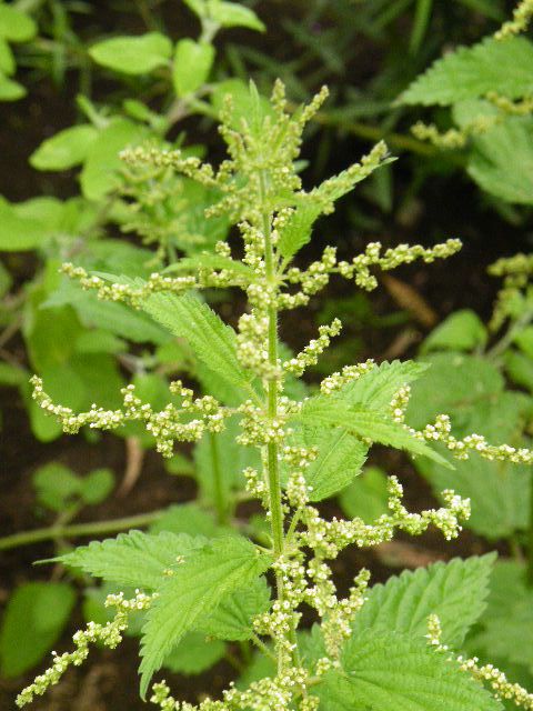 イラクサ科の スティンギングネトルStinging Nettle のStinging は 棘のある の意ですね。コモンネトルなどとも呼ばれます。学名は Urtica dioica、和名はセイヨウイラクサです。うちでは1m位の高さになります。1度根付きますと根や種で増え、寒さに強く余り土地も選ばす丈夫です。毛糸モールヤーンの様でヘロヘロとした花序に、目立たない小さな花が夏に沢山咲きます。種をこぼす前に刈り込み、時々根を切り、必要以上に増えない様にしているのですよ。ネトルと呼ばれるものの中には毒性の強いものがあるそうですので、その点でも注意は必要ですね。