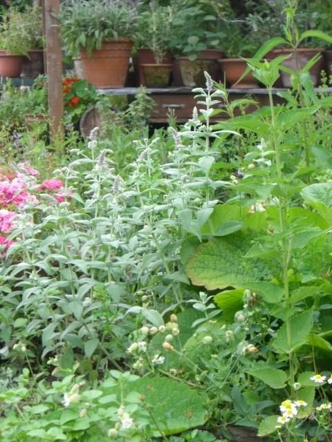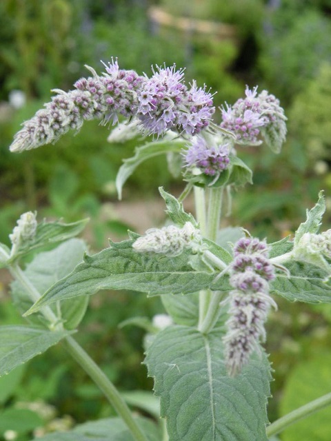 大きくなるミント、灰色っぽいミント、という印象です。茎は直立して草丈は1mを超え、小さな花が穂状になり次々と咲いて目立ちます。毛が生えて灰色がかった緑の葉に、ライラック色の花がきれいですね。6月から8月位まで咲き、うちでは6月下旬~7月の中旬が一番の見頃です。台風対策として支柱をしていた頃もありましたが、ここ数年は花を摘みながら早めに茎を切る様にしています。薬用や料理の香り付けなどにされ、クラフトやアレンジにも向きますね。うちは庭作りに多く使っているミントなのですよ。