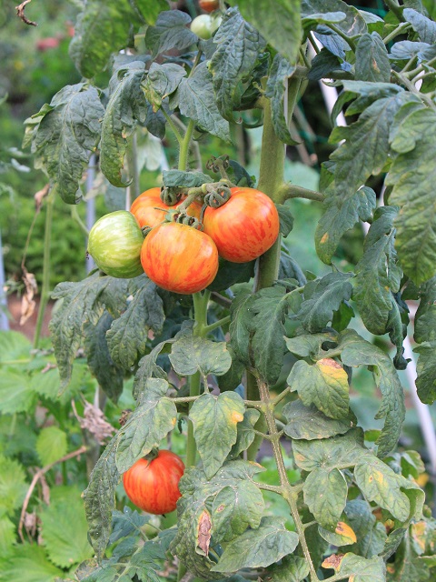 これもお皿の上でオシャレ度高いわね?ということで今年も種まきをしたレッドゼブラトマトです。昨年の余りの種子でしたがよく発芽をして、蒔いただけ芽が出た感じがします。オシャレ度高いのよ、と(笑) 友人たちに苗を配り、うちの菜園には2本植えました。栽培は普通のトマトに準じますね。生り始めはグリーンゼブラトマトのようですが、次第に色付き赤とオレンジの面白い縞模様になっていきます。ゼブラというネーミングはここからですよね。生食でも食べ易く、うちでは5cm位の大きさが出来ました。収穫時期の終わり頃は他のトマトと一緒にソースにしますが、出来るだけこの模様を生かしたひと皿にしたいと張り切ってしまうのですよ。