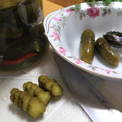 見惚れていて時期を逸してしまわないよう収穫(笑)、塩漬け発酵ピクルス作りを始めます。家庭によりご自慢の作り方やこだわりの材料があるでしょう。うちはピクルスキュウリの他は、ディルの葉と花、塩、ニンニク、唐辛子、ベイリーフ、水、と身近な材料で作っています。出来上がるまで約1か月です。甘みのないものですね。発酵が始まると濁る漬け汁が少しきれいになり、発酵が終わるサインです。その後はもうひと手間掛けて、澄んだ漬け汁で保存するのがちょっとこだわりです。出来上がったばかりの色から古漬けっぽい色に変わりましても中味までパリパリっとした歯応えでおいしいです。 ピクルス液を作って漬ける即席ピクルスも好きなのですよ。そして丁寧に手間と時間を掛けて作った塩漬け発酵ピクルスの発酵で生まれた酸味、独特の風味も好みです。そのまま食べる他、チーズやバターそしてポテトサラダやパンプキンサラダにハーブと一緒に混ぜて、又ソース作りなどに使っています。