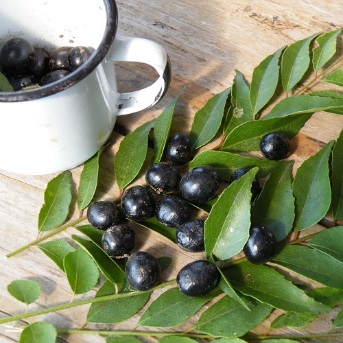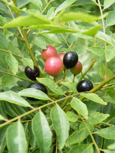 手元の本には、樹皮や葉や根を薬用として使う事や、葉、花、果実は食用にする事。また主にカレーリーフと呼ばれる葉はハーブとして、熱した油に香りを移して使う、そのまま煮込む、パリっと揚げて食べる事。またごく若い葉をそのまま料理に散らすなどの様々な用途やレシピが書かれています。もちろん、乾燥した葉やそのパウダーも使われていますが、乾燥した葉は香りが弱まるため生で料理するのがよいという事が、ほとんどの本に書かれています。冬以外は新鮮な葉を収穫することができますので、葉の乾燥保存は少しだけにしています。集まって咲く小さな花は香りが強く綺麗で、実は緑から赤になり、熟すと黒くなりますね。種は有毒と書いてありました。