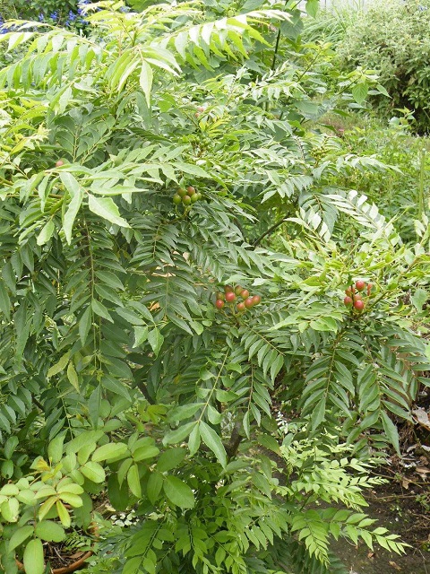 カレーの木 Murraya koenigii はミカン科、オオバゲッキツ(大葉月橘)、ナンヨウサンショウ(南洋山椒)。常緑の木で大きくなると6mにもなるそうです。うちでは剪定で1.5〜2m位に抑え、寒い時期は無加温のフレームに入れています。ほとんど落葉してしまった冬もありましたが、暖かくなるに連れてまた緑の葉が茂ってくれました。普通の用土、日当たり、水遣りで特に問題なく育つだけでなく、できた種をまきますと増やすことができます。私は実が黒く熟しましたら、取播きにして苗を作り、随分と友人たちにあげました。こぼれた種から芽を出していることもあるのですよ。