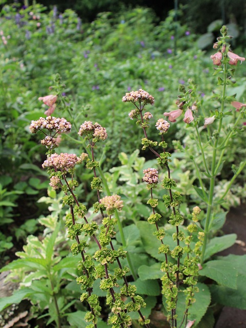 オレガノ ‘オウレウム クリスプム’ は小型のオレガノの園芸品種のひとつで、縮れた丸い小さな黄緑色∼金色の葉が綺麗で面白く、擦るととても良い香りがします。ゆっくりと育ち、5月6月の葉は特に爽やかで他の緑の中で目立ちます。観賞用の他、料理などにも使われますね。マイルドな風味だと思いました。
