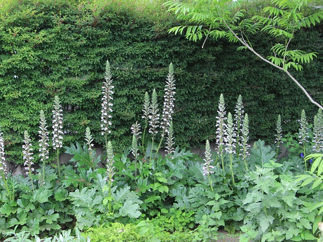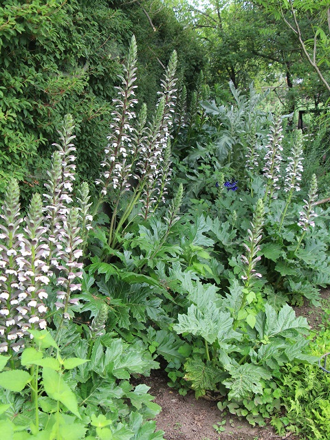 10年程前の夏、忘れもしないミョウガを採りに庭に出ますとポッツン、少ししてポッツンと新聞紙に小石を落としたような音がしました。よく見ますと花が終わったアカンサス モリスが地面に種を飛ばしていたのですよ。そうなのですよね、春になりますとあちらこちらから芽を出し増え続け、何年か経った株と小さな株とで高低ができます。適当に抜いている今は、株分けをして真剣に増やしていた頃が懐かしく思い出されます。また草むしりをしていてひょいと見上げた先のアカンサス モリスの花弁の上に、まるで今にも飛び出そうとしているカエル?が沢山いて驚いたことがありました。笑ってしまいますね、花蕊でした。