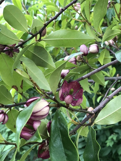うちの庭木になっているカラタネオガタマ(トウオガタマ)は、カラタネオガタマ ‘ポートワイン’ Michelia figo ‘Port Wine’ という品種で、カラタネオガタマの淡黄色の花にワインを染み込ませたような濃淡のあるワイン色の直径3cm位の花です。モクレン科の常緑小高木で、剪定をして3m位にしています。花期は4月の終わり~5月の始め頃からで約3週間ととても短く、その他の時期はつるつるした葉が茂るばかりです。然し一旦この花が始まりますと1、2日ではらはらと散らしては次々と咲き、さあ採って、近くに置いて、お茶にして、という香りを庭に放ちます。バナナに似た甘い香り、といわれますが、本当にそのような香りで、晴れた午後にはひと重ね強い香りを感じます。