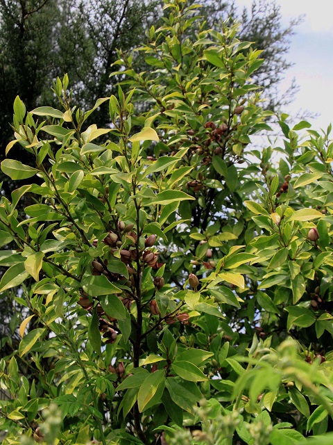 カラタネオガタマ(トウオガタマ)は中国に分布しており含笑花で知られますが花が、半開き状態で咲くことからとありました。そして カラタネ とは渡来してきたとか、種を付けないからなどの説があるようです。実際には全く種を付けないということはありません。弾け出た種子は赤いです。Banana shrub バナナノキなどでも知られます。花からヘアオイルを採ったりするそうで、もっと知りたい木のひとつです。