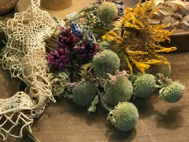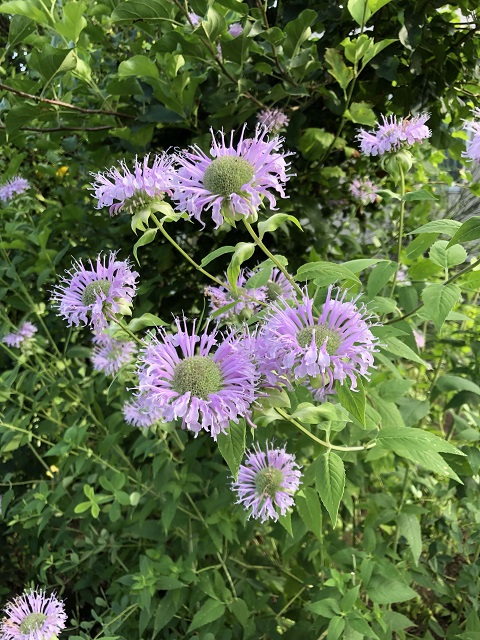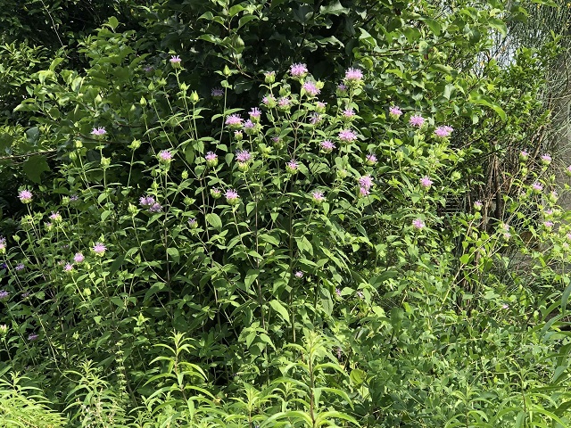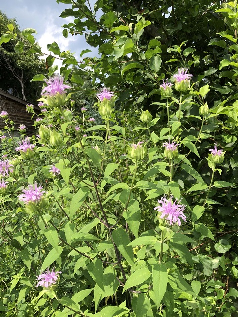 ワイルドベルガモットは耐寒性多年草で、冬期は地上部がなくなり、また春に芽吹き1年で90〜120cm位の高さに伸びます。6月頃は茎の先端に出てくる花序を包む淡い緑の苞葉が爽やかで、7月頃から薄い少し紫掛かったピンクの花を咲かせ始めます。そして数週間、直立し分枝した茎に絶え間なく花を咲かせます。茎は時期により紫色が目立ちますね。丸く集まって咲く花一つひとつは小さく小海老の様。このワイルドベルガモットは柑橘類とオレガノを混ぜた様な香りがし、全体的に少し繊細で柔らかい印象を持ちました。然し、地下茎で旺盛に広がり、この地下茎は地表にも顔を出し這って入り組み土を硬くします。頃合いを見計らって堀上げ、根を整理して植え直しをしたり植え場所を移したりしています。普通の日当りでよく育ち、風通しを良くするとうどん粉病を減らすことができます。薬用や香味料などの用途があるハーブ。独特な香りを生かしてポプリや切り花にもします。花後のまん丸な淡い緑の萼も可愛らしく夏の花材に誂え向きで、秋のクラフト用にドライフラワーも作っておくようにしています。庭では暑さを和らげてくれる色と草姿が綺麗です。