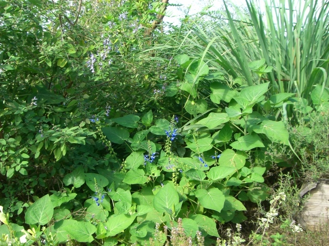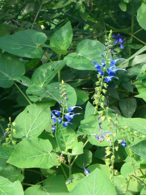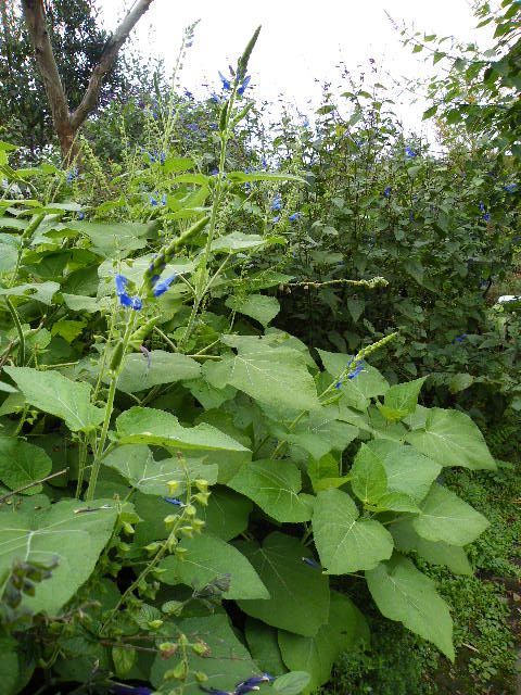 毎年楽しみなサルビア マクロフィラです。美しい青い花が魅力的で、葉の長さは20cm位、花穂は30cm位になります。小さな苗を植えてもひと夏で半畳くらい、もっとでしょうか、どんどこ広がっていきます。適当に剪定をしながら鉢植えでコンパクトに育ててもきれいですね。