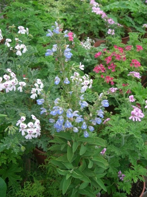 サルビア ソマレンシス (ソマリアセージ)の白いマークのある空色の花がきれいです。葉に香りを持っていますね。しっかりと木質化しています。常緑だそうですが、うちでは寒さでダメージを受けてしまうので冬は無加温のフレームに入れているのですよ。