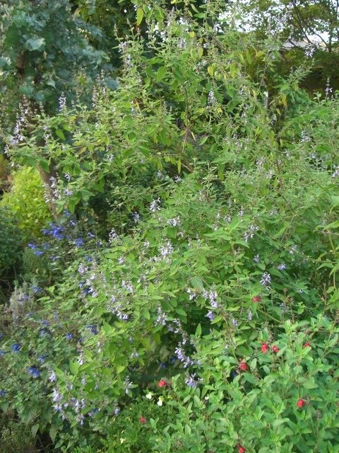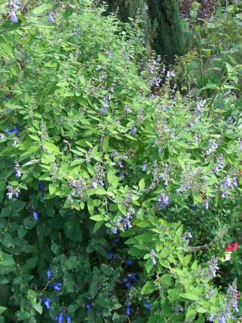 サルビア メリッソドラ(グレープセンテッドセージ)は2m以上になる木で紫がかった薄いブルーの花をたくさん咲かせます。横にもたっぷりと広がって、比較的小さな花も葉の色もうつくしいです。花はブドウのような不思議な香りを持ち、生乾きの葉もよい香りがしますね。