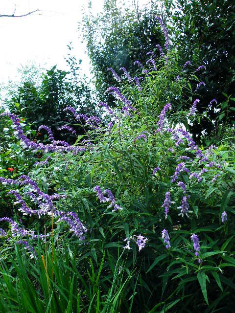 紫のガクからうっすら紫がかった白い花サルビア レウカンサです。最近は夏でもちらちらと咲くのを見るようになりましたが、本来は秋咲きだと思います。メキシカンブッシュセージ、アメジストセージとも呼ばれ、メキシコ、中南米が原産だそうですね。種まきをしたものの中には、ガクの色と花色の濃淡が大分違うものがいくつかあります。有り触れたサルビアだと思っていましたのに、どれが本当の姿なのか分からなくなっています。
