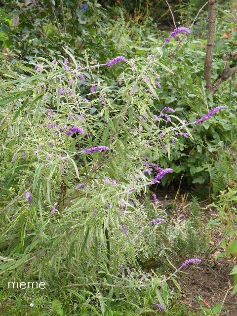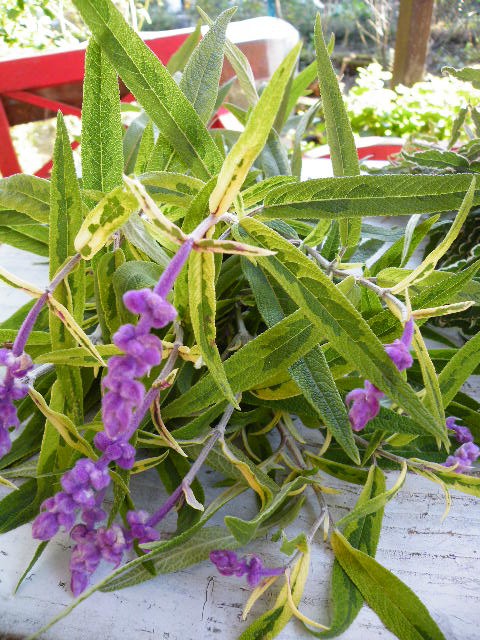 これは サルビア レウカンサ (メキシカンブッシュセージ)の葉に黄色の斑が入ったものです。数年育てていますが、変わらずに斑が入ります。S. leucantha‘Eder’という園芸品種があるそうですが、同じでしょうか?