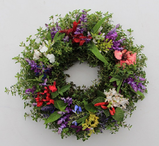 花は少し小さくて紫のガクから紫が咲きドライフラワーにしますが、葉の斑を生かすのであればフレッシュでアレンジがいいですね。庭では秋の陽に輝くうつくしい葉です。