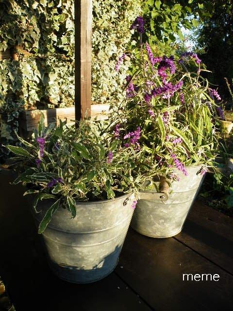 葉に白色の斑が入るサルビア レウカンサです。花は紫のガクから薄紫が咲き、斑の入り方はいろいろで、葉がうねっている株もあります。黄色の斑が入る葉のレウカンサと並べて植えたり、しっかり水揚げをしたフレッシュの葉をアレンジしたりしています。