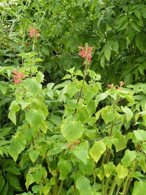 サルビア エクセルタ のオレンジがかった赤色のきれいな花が咲き出しました。ボリビア原産だそうですね。4月の上旬に種を蒔いたのですよ。飛び出した‘赤白の水引’を思わせる雌しべと雄しべが面白く、葉は少し照りがあります。