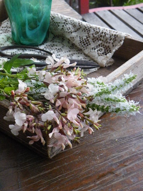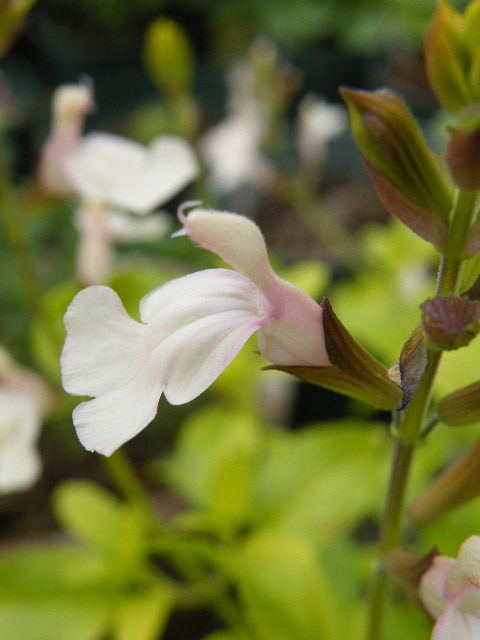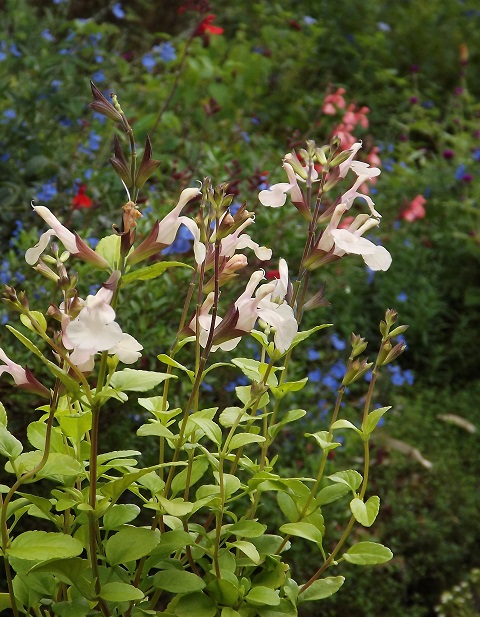 サルビア‘ムーンライトオーバー’は薄いクリーム色を、ほんのりピンクやベージュで染めたような花で、その濃淡がかわいらしかったり大人っぽかったりします。黄緑っぽい葉は、他の緑の中で目立ちますね。光沢があり、擦るとよい香りがします。春は葉の真ん中の緑の斑が薄ら分かりましたが、今はすっかり消えています。