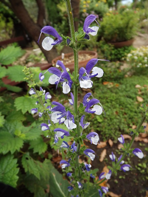 サルビア‘マデリン’は青紫と白のツートーンカラー、かなり個性的な花を咲かせます。昨年の春に苗を植えて育て始めたのですよ。初めて見た時は S.プラテンシスに似ていると思いました。5月から初夏まで咲き、その後は葉が勢いよく育ちましたが、秋は咲きませんでしたね。鉢植えで草丈50cmくらい、種をしっかり付けました。