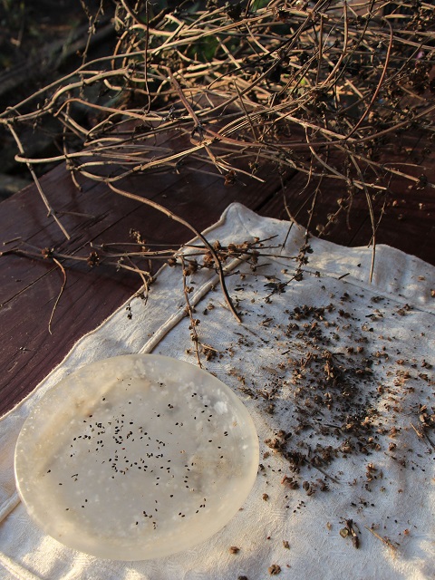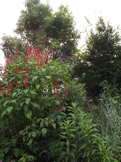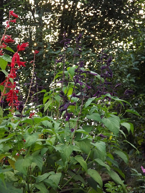 これはパープルの花が咲く方のSalvia splendens‘Sao Borja’です。オレンジと同じく、2mを優に超える程に育ちました。茎はしっかりしていますが、強風などに備えて支柱をしたのですよ。花は暗い紫です。とても素敵な色の花ですが昨年、オレンジの横に植えてすっかり引立て役になってしまいました。今年は高低差を付けてこちらにも目が止まる様に工夫してみますね。5月から霜が降りるまで長く咲いてくれます。暖かい所で越冬させてもよいですし、大きくなるのが早いので毎年種をまいてもよいですね。
